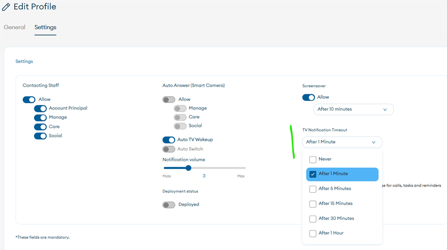 To make things easier for clients who might find the remote control challenging to use, we’ve added new options in the Care Portal (web) to manage the timeouts for notifications shown on the TV through the Wellness Hub.
