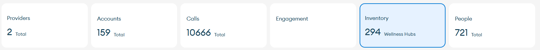 Initial metrics include total counts for: Providers, Accounts, Activity, Engagement, Inventory, and People.