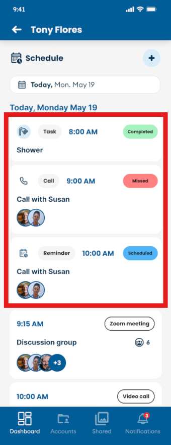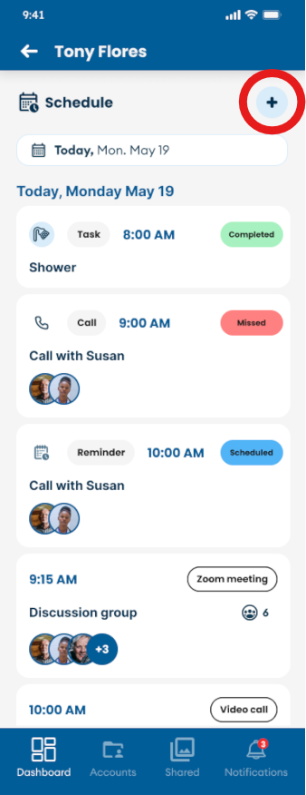 - Add calls, reminders and tasks from the schedule page by clicking on the "+" button